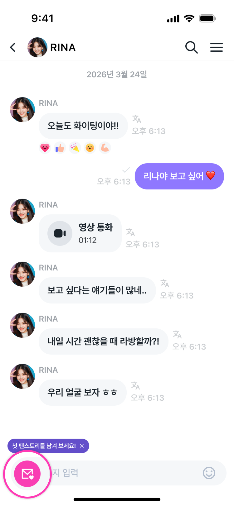 - 위치: 아티스트 채팅방 하단 입력란 왼쪽 팬스토리 아이콘 터치